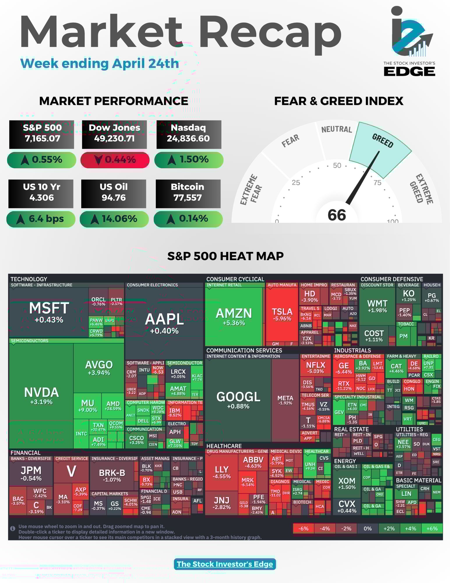The S&P and Nasdaq had yet another positive week, as mega cap tech and semiconductors surged following Intel’s earnings. Meanwhile, oil prices saw another big jump.