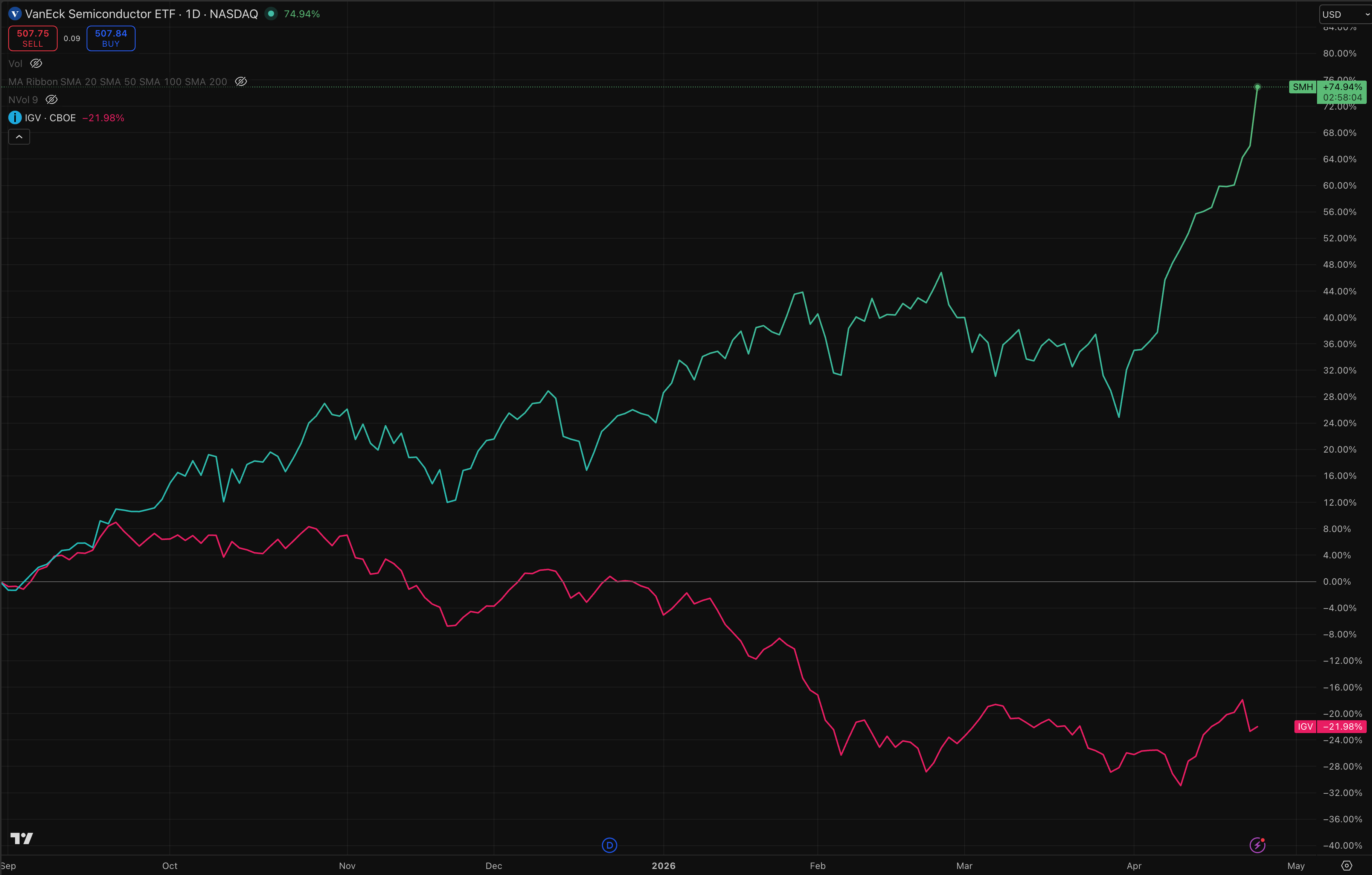 Semiconductor and software stocks have moved in opposite directions for most of 2026, creating one of the biggest splits the tech sector has seen in years. This week, earnings results from major companies on both sides made that contrast impossible to ignore. The semiconductor ETF $SMH ( ▼ 2.97% ) is up over 41% this year while the software ETF $IGV ( ▼ 0.5% ) is down 21% over the same stretch.