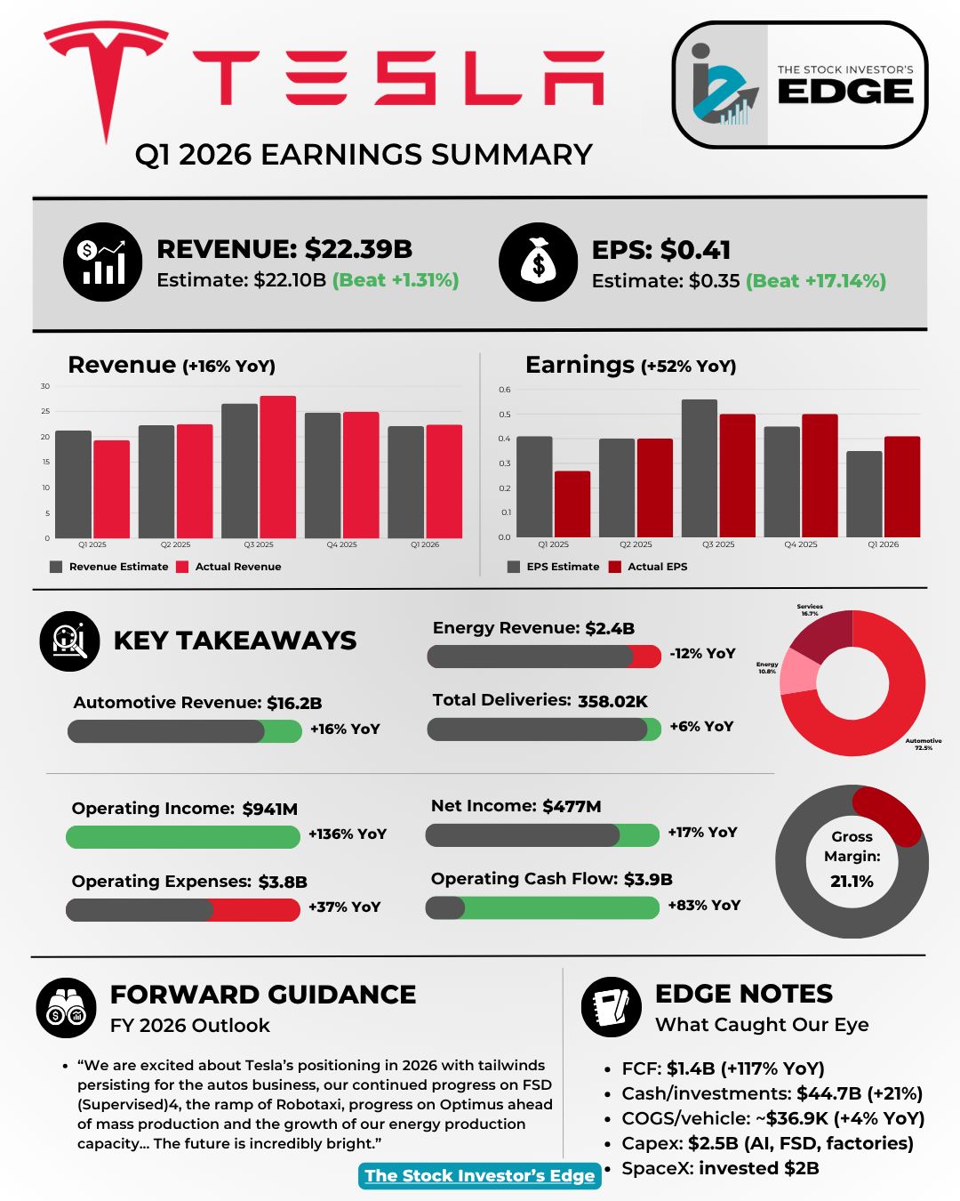 Tesla $TSLA ( ▼ 0.7% ) posted its strongest gross margin in years and a sharp free cash flow reversal, though one-time tariff and warranty benefits muddied the quality of the print and deliveries came up short.