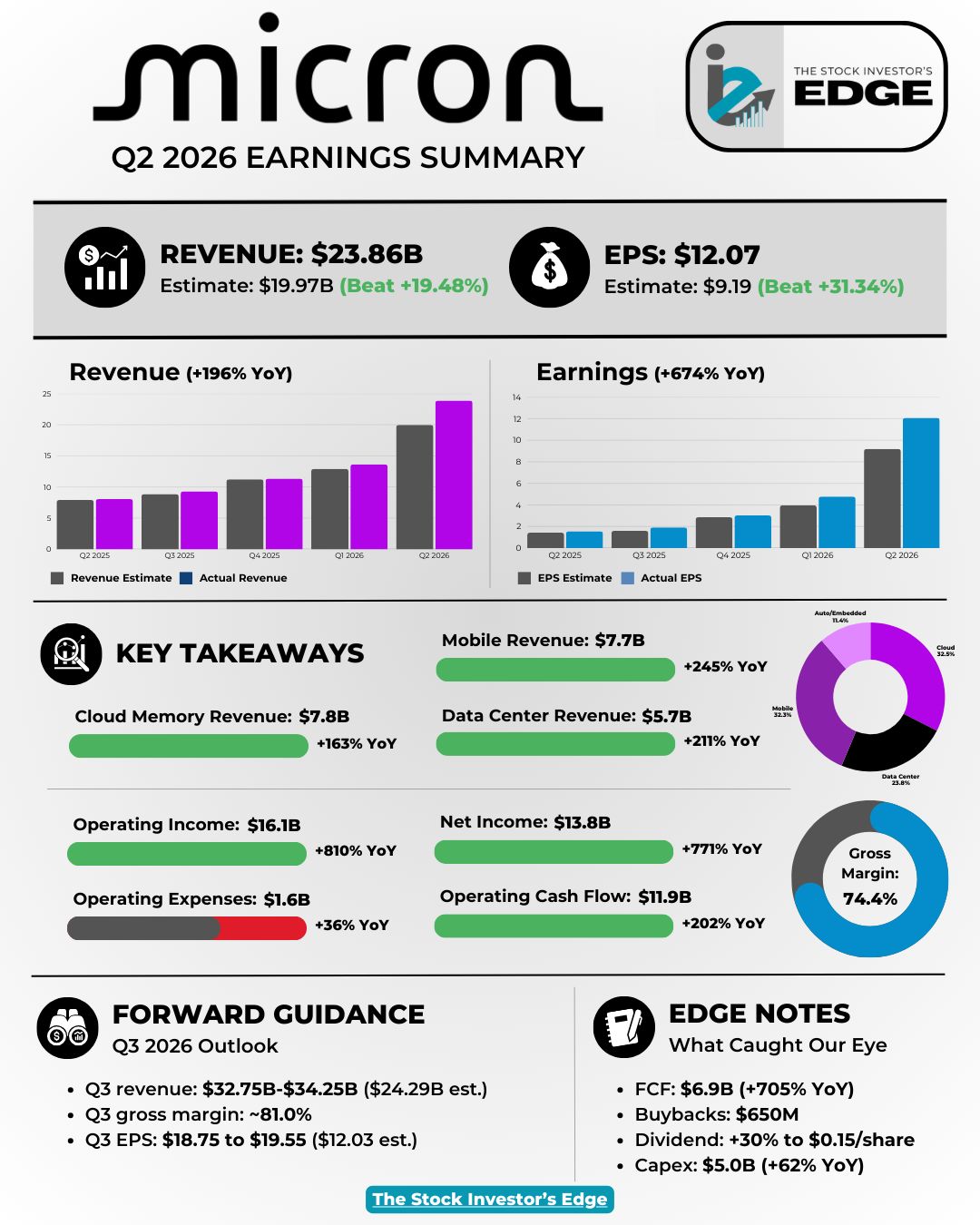 🔐 Edge Takeaway: Micron just put up one of the strongest quarters you will see across semis, and the stock being down -9% since reporting comes down to…upgrade to Edge+ to read the Full Edge Takeaway.